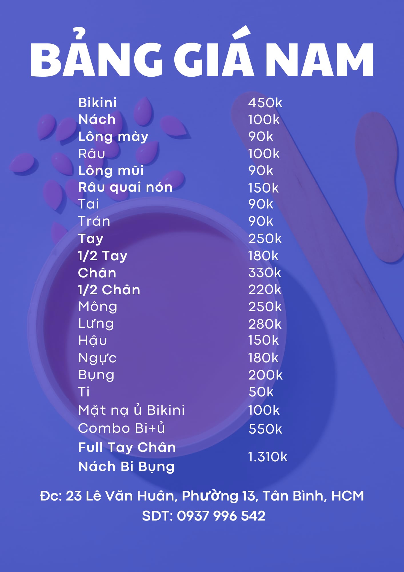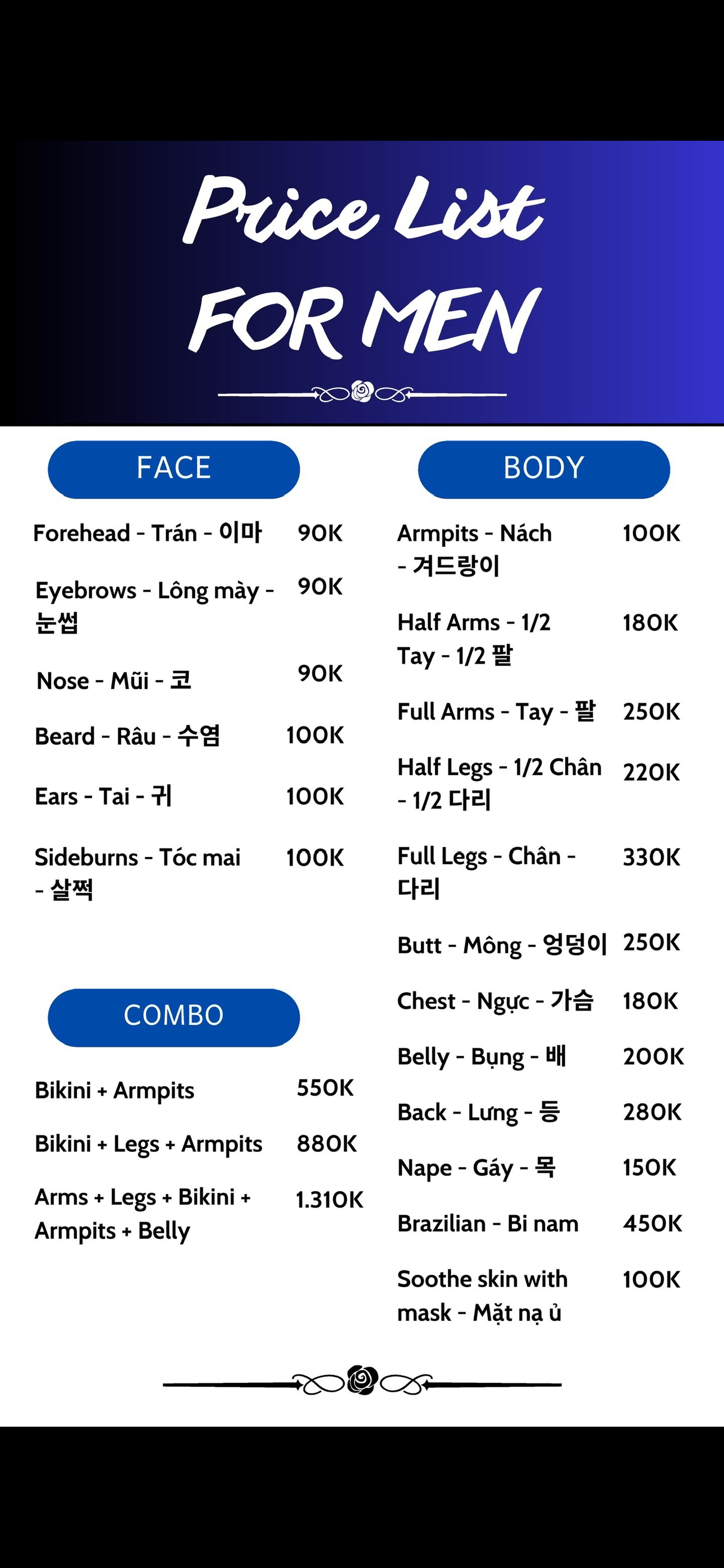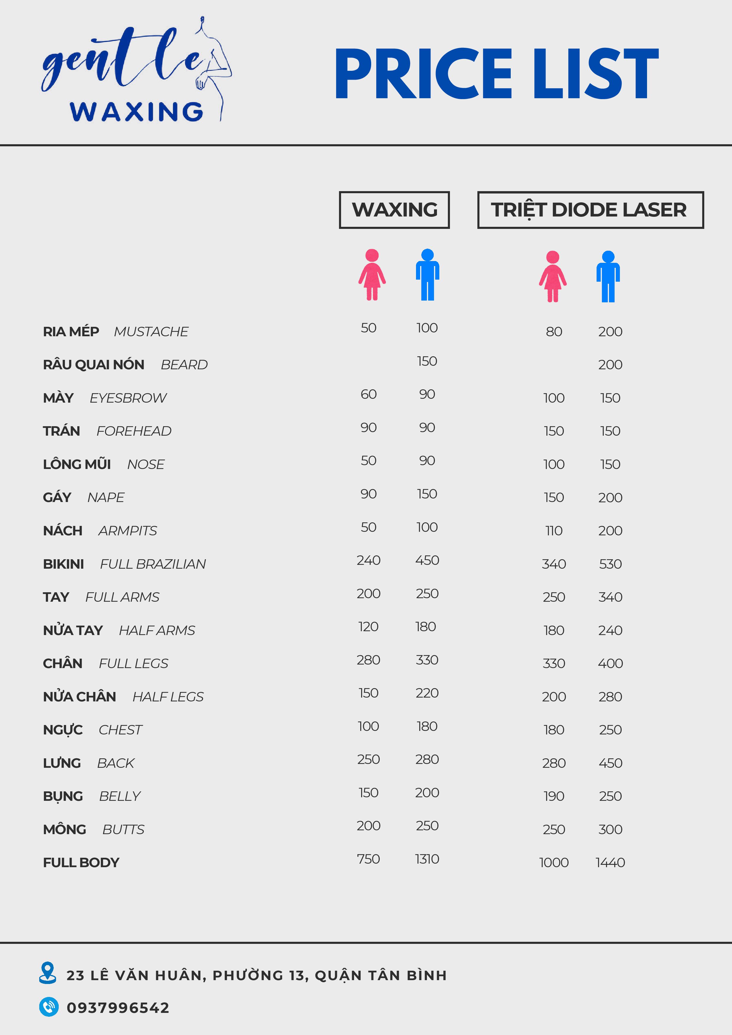 Giá wax nam đây ạ, wax bi nam là chạy nhất, 450.000 wax từ trước ra sau lun ạ, có wax tạo hình theo yêu cầu, wax hết hay chừa lại đều được, có dv cắt tỉa thì 250.000 ❤️