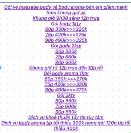 • Dịch vụ body aroma: Tip tối thiểu 300K.