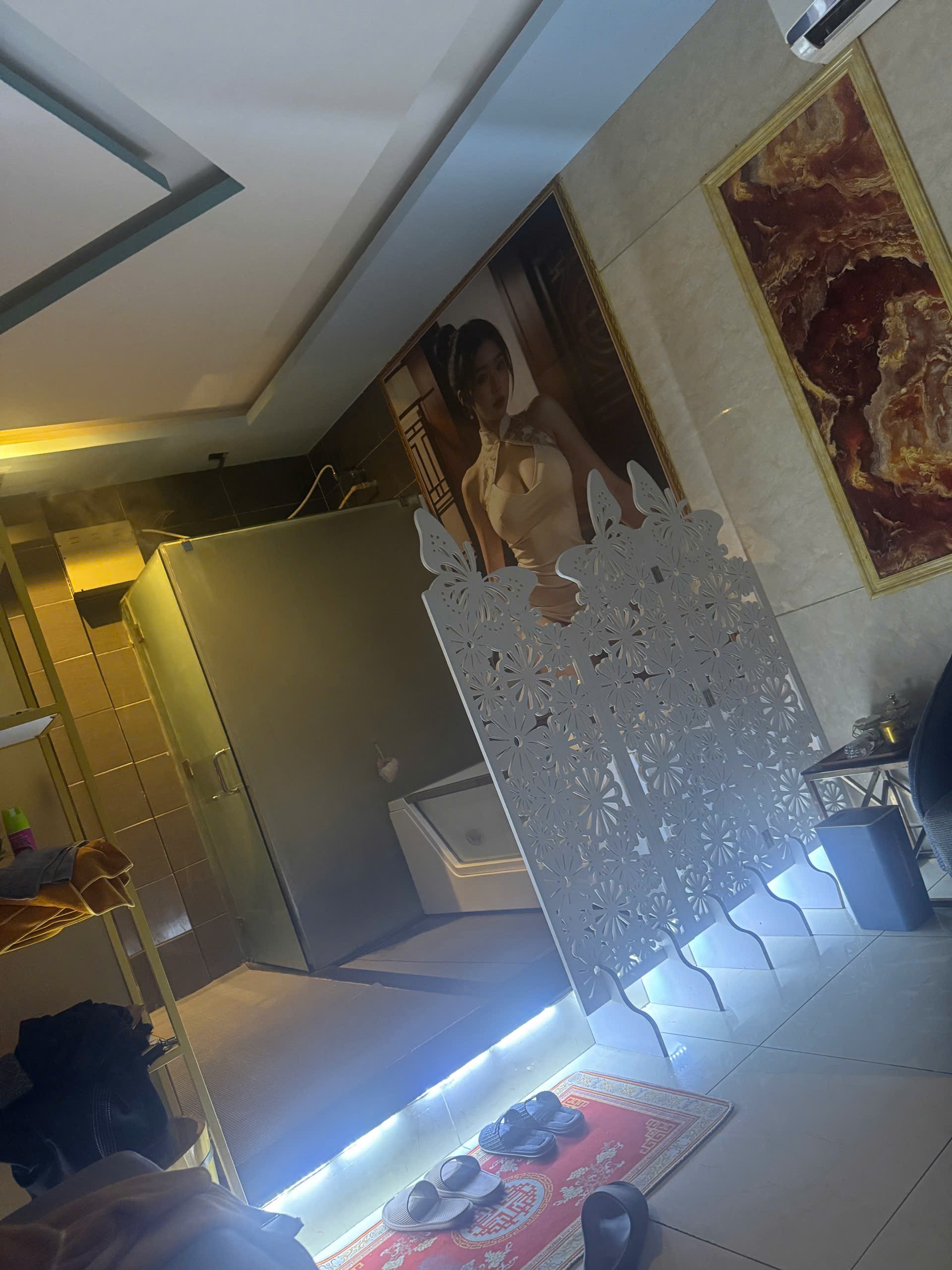 Vào lễ tân thì được mấy chú em locker tiếp đón nhiệt tình mời nước uống xong xuôi cũng lên phòng ngâm chân 1 lúc thì bé vào lau chân và xông hơi xong cũng tắm rửa sạch sẽ nằm lên giường